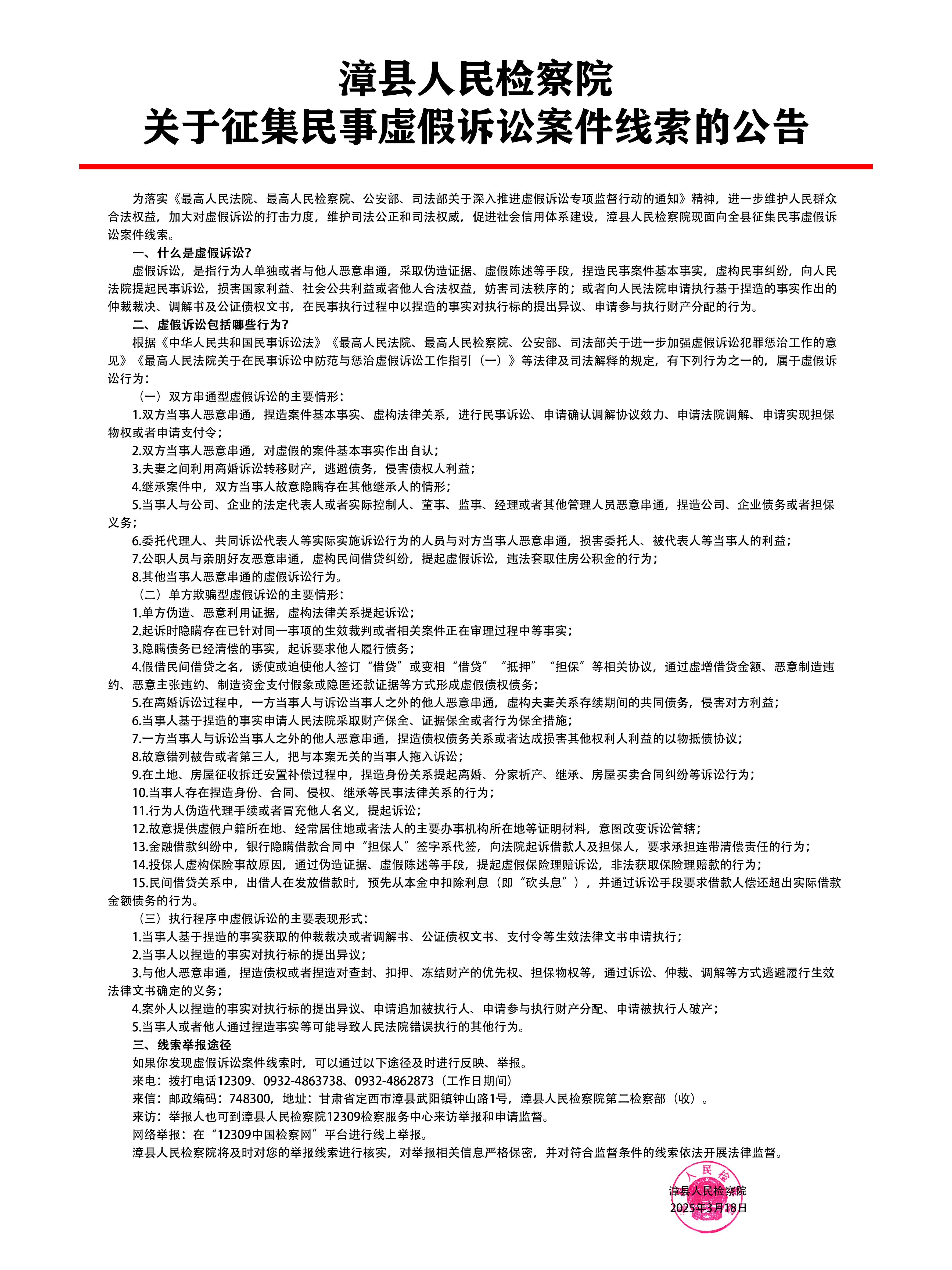 • 漳縣人民檢察院關于征集民事虛假訴訟案件線索的公告